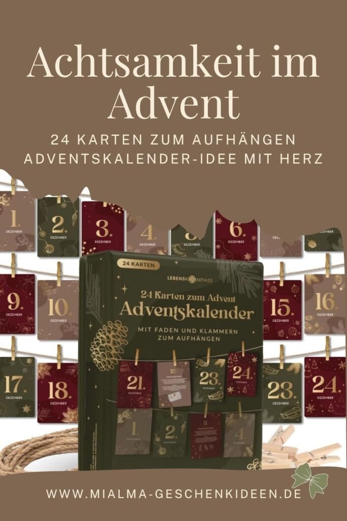 Entdecke einen besonderen Adventskalender: 24 liebevoll gestaltete Achtsamkeitskarten zum Aufhängen – perfekt für die Vorweihnachtszeit. Jeder Tag bringt eine kleine Auszeit, inspirierende Impulse und Momente der Ruhe. Mit Faden und Klammern zum einfachen Befestigen – ideal als Geschenk, für dich selbst oder zum gemeinsamen Erleben mit der Familie.